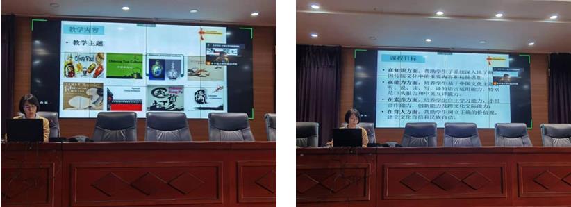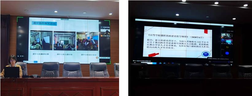 《中国文化英语》课程为例,围绕该课程的课程思政建设,针对“线上线下混合式教学设计”案例进行了介绍。郭老师通过介绍了课程开设背景、课程目标、教学材料、教学主题、教学评价、教学考核方式、课程和教学改革解决的重点问题,详细地介绍了团队教师在课程思政教学内容挖掘、学生活动设计,以及课程思政元素在教学评价中的设计等。同时,运用“以学生为中心”和“以产出为导向”的认知递进式教学法进行教学设计。主要包含课前主题相关材料讨论和整理,课中主题翻译练习、主题试听练习、主题词汇应用、以及主题小组翻译比赛活动,外加课后线上线下采访、设计单元测试卷、主题作文活动以及主题“明信片”设计的课后拓展活动,帮助学生系统了解中国传统文化重要内容、培养了学生中国文化主题听、说、读、写、译的语言能力,而且还培养了学生的分析表达能力、创新思维能力、总结概括能力、小组合作能力、跨文化交际能力以及学生自主学习能力。最后,以“中国瓷器”主题为教学案例,深入地介绍了如何在课程中融入思政元素,达到“润物细无声”的效果,从而将语言目标、知识目标、素养目标和育人目标做到有机统一。