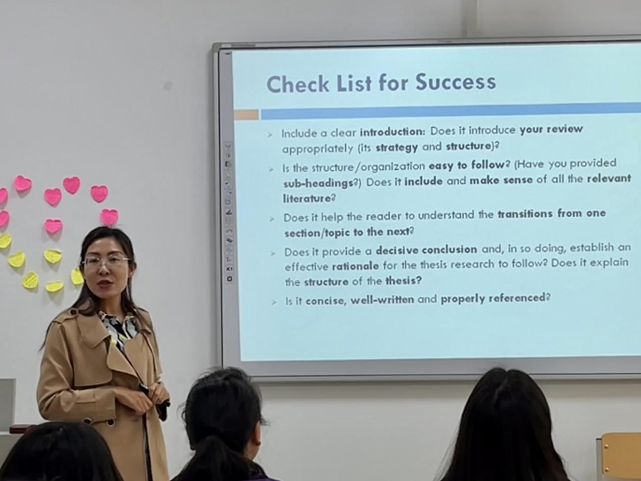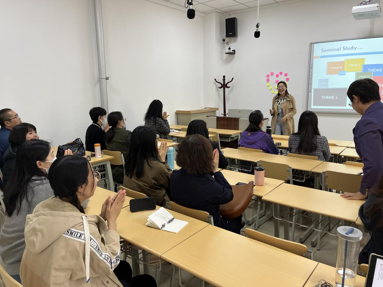 最后,教学名师工作坊负责人郭鸿雁教授对本次活动进行了总结,她高度肯定了刘颖老师的精彩分享,认为本次活动不仅能够帮助老师们认识到文献综述对于论文写作的重要性、了解其不同文化背景下的具体写作方法,也对今后论文写作课的改进有一定启示作用,与会教师均表示有收获、有思考、有提高。郭老师也对教学名师工作坊的后续活动进行了介绍,鼓励更多师生积极参与进来。
