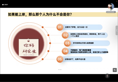 英语语言文学专业)以“山有顶峰,海有彼岸”为题目,从考研目标、复习规划、学习方法、资源整合、考试内容、职业规划等方面进行分享。