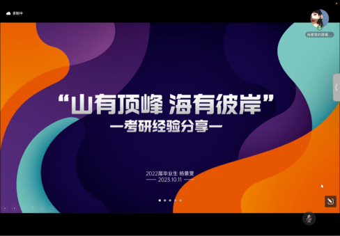 于2023年10月11日晚7点在线上召开2020级考研动员大会。参加此次动员大会的有胡笑瑛副院长、王炜晨老师、优秀毕业生杨景雯以及2020级全体学生。会议由胡笑瑛副院长主持。