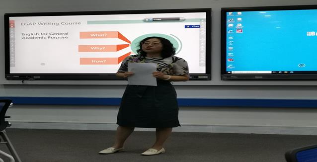 在主旨发言中,朱洁老师介绍了大学英语学术英语写作模块课程的建设、教材使用、小组合作学习模式的实践,并就上述问题如何在课堂设计,课堂活动中体现,与各位老师进行了探讨。