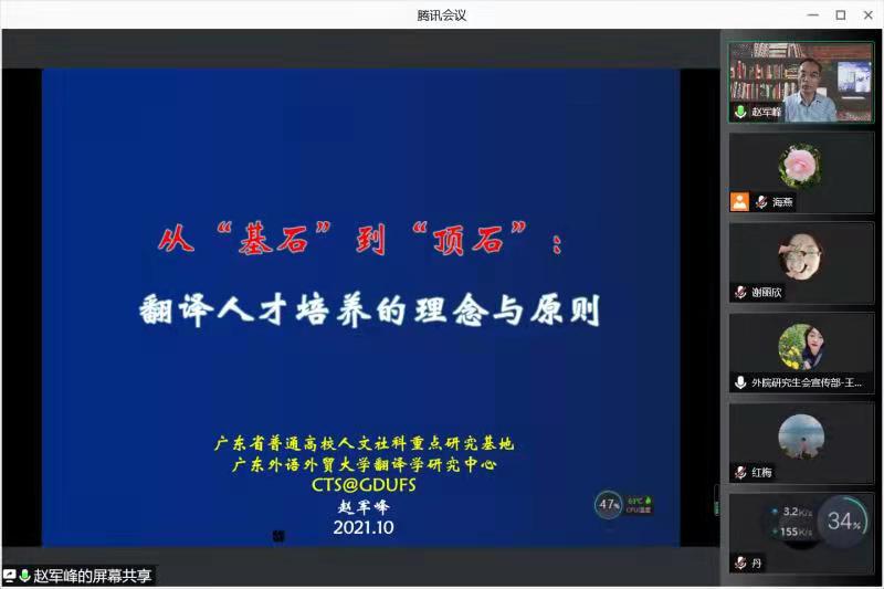 翻译硕士培养予以线上指导。赵军峰教授在“腾讯会议”平台以“从‘基石’到‘顶石’翻译人才培养的理念和原则”为题进行线上讲座。皇冠体育博彩