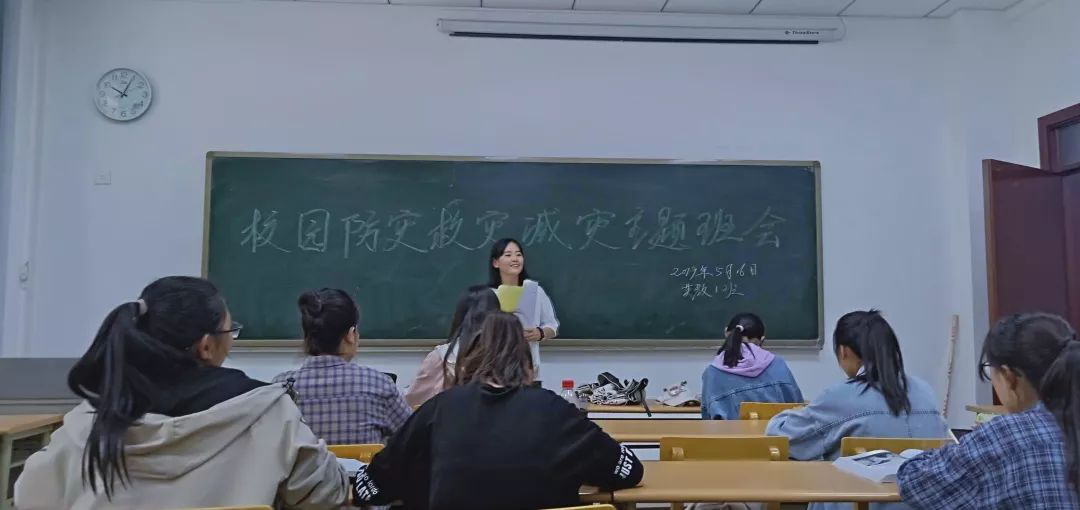 班会开始,团支书通过问题”面对灾难,你会怎么做"引出此次班会的主题。为了让同学们更深入的了解,各团支书以地震为例用图片和视频资料深入浅出地向同学们讲述了如何认识地震以及防震避震与自救互救的知识。之后,团支书组织同学们展开讨论,针对校园中常见的突发事件以及典型校园灾害案例向同学们讲述校园安全的重要性。在同学们的积极参与下,班会画上了完美的句号。