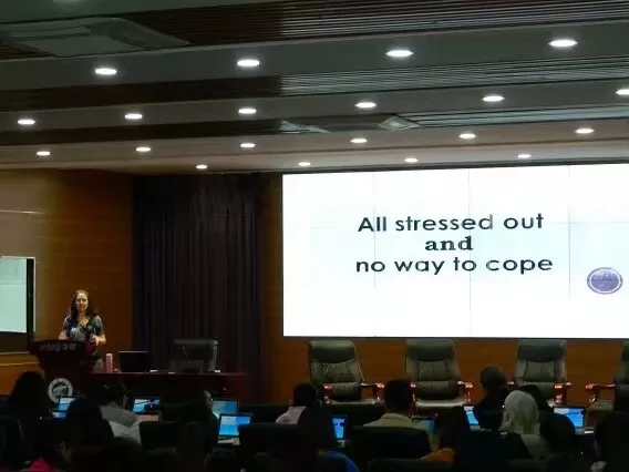 本次活动以“All stressed out and no way to cope”为主题,围绕我们身边的压力展开讨论。活动伊始,Miss Carolyn Stent老师在大屏幕上为同学们展示了我们学习和生活中的各种压力来源,引导大家以此为话题用英语与身边的同学交流、讨论。同学们不仅说出了自己的困扰和烦恼,还提高了英语表达能力。