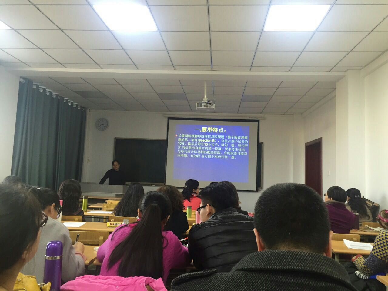 大学英语四级考试专题讲解主题活动包括分模块教学经验交流环节和集体讨论环节。在第一环节中,郑晓英老师就四级写作技巧、三种类型作文及作文改错方面同各位老师进行交流;韩芳老师就四级听力的题型分值和解题技巧与策略进行了讲解;赵晓娥老师、杨晓丽老师、以及杨胜兰老师分别就阅读试题中的选词填空、长篇阅读、传统阅读技巧进行了经验交流;张静老师分享了四级翻译题型的教学方法。之后,各位老师就大学英语四级题型解题技巧和方法进行了交流和讨论,教研气氛活跃,老师们均表示获益匪浅。