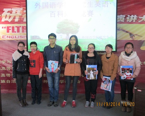本次大赛共分为四个环节。第一环节是笔试抢答环节,由所有到场观众参与答题,答题时间为六分钟,得分前二十名同学进入第二环节。第二环节是现场作答环节,每题答题时间为10秒,共30道题,得分前十名同学进入第三环节。第三环节为主持人问答环节,将上轮十名同学分为五组,两两作答,每题限时五秒,最后,以该组答题数多的选手获胜,进入第四环节。第四环节为终结PK环节。本环节由一名同学守擂,其他同学攻擂,选手答题时间为五秒,若无法在五秒内作答或答错,选手则视为淘汰。每轮答题每位同学有且仅有一次现场求助的机会,若求助失败,则答题失败,视为淘汰。在经过四轮精彩的角逐后,2014级翻硕班马存智同学技压群雄,获得本次比赛第一名,牟李园、苏楷婷等同学分别获得二、三等奖。