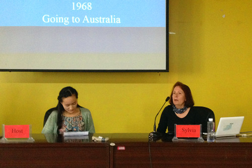 瑟维亚出生于西班牙,在法国长大,21岁时移民澳大利亚。她曾从业于宝石行业、采矿业、旅游业和餐饮业,工作经验和生活阅历非常丰富。已69岁高龄的瑟维娅在过去的六年里沿长城徒步行走了3000多公里,在中国游历长达八年之久。在专访过程中,她幽默风趣地讲述了自己的中国旅行故事,和同学们分享了她的教育旅行计划,并从澳大利亚旅游业的发展出发对中国旅游提出了中肯建议。在谈到自己独自一人穿过甘肃戈壁和敦煌沙漠的经历时,瑟维娅几次哽咽,感激所有好心人在旅行过程中给予她的真诚帮助。