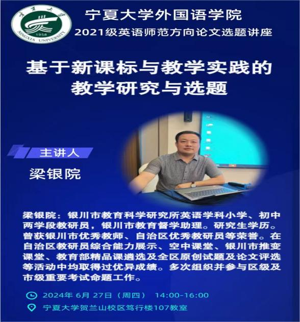 邀请银川市教育科学研究所英语学科教研员、银川市教育督学助理梁银院老师,开展了“基于新课标与中学英语教学实践的论文选题”讲座,2021级全体师范生参加了讲座。