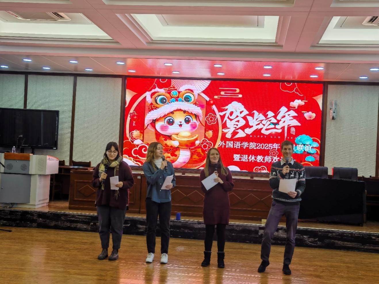在老师们热情的欢呼声中,联谊会正式拉开帷幕。在“恭贺蛇年”的大背景下,几位研究生代表带来了激情四射的开场舞。动感有力的舞步,瞬间将现场观众的热情点燃。接着,有马真老师的男声独唱《游牧时光》、有唯美的舞蹈《娥嫚》、有外教老师的歌曲表演、有皇冠体育博彩