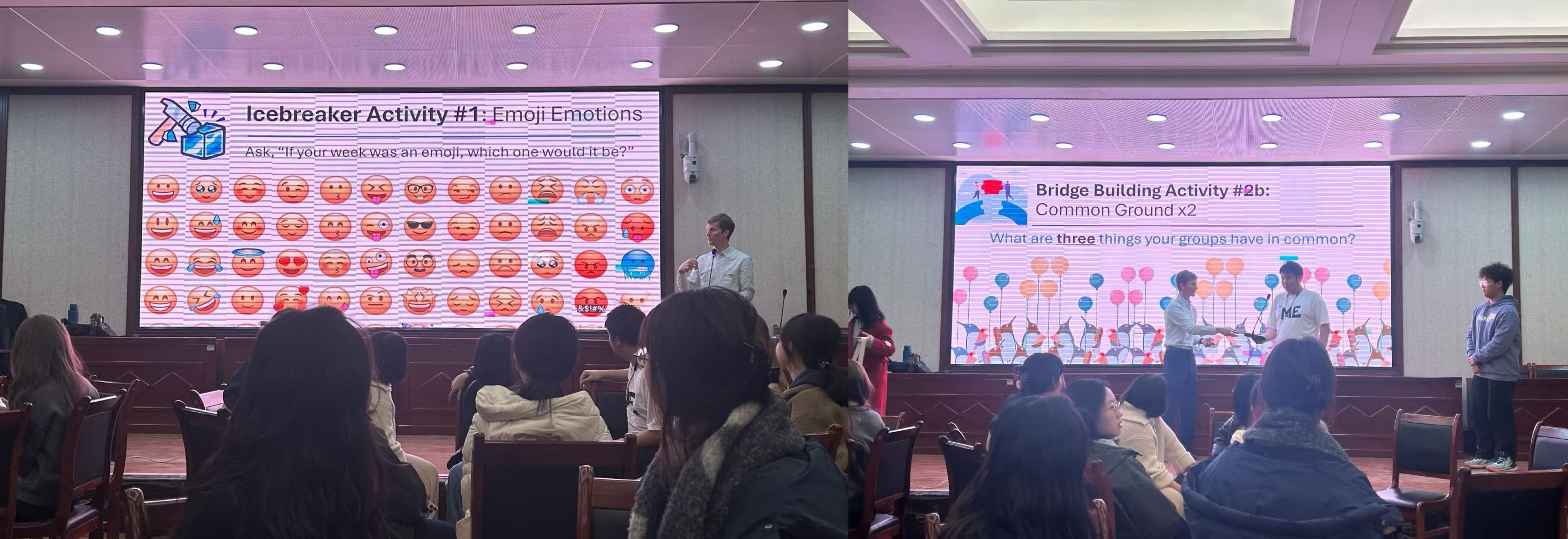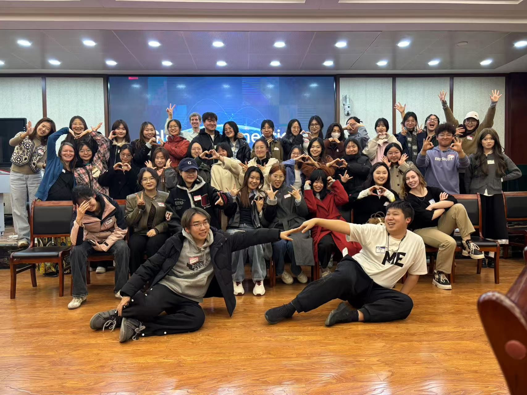 互动环节围绕“你最喜欢的季节是哪个?”“你最想创造的东西是什么?”“如何帮助他人走出舒适圈?”等话题展开,从轻松提问逐步深入。同学们在倾听与表达中加深了了解,在沉浸式交流中提升了语言运用与跨文化沟通能力。在无声互动游戏环节中,参与者依靠手势完成了按姓名、家乡首字母顺序和年龄大小排序等趣味任务。无需言语,彼此间的默契与配合悄然建立,现场氛围愈发轻松愉快。