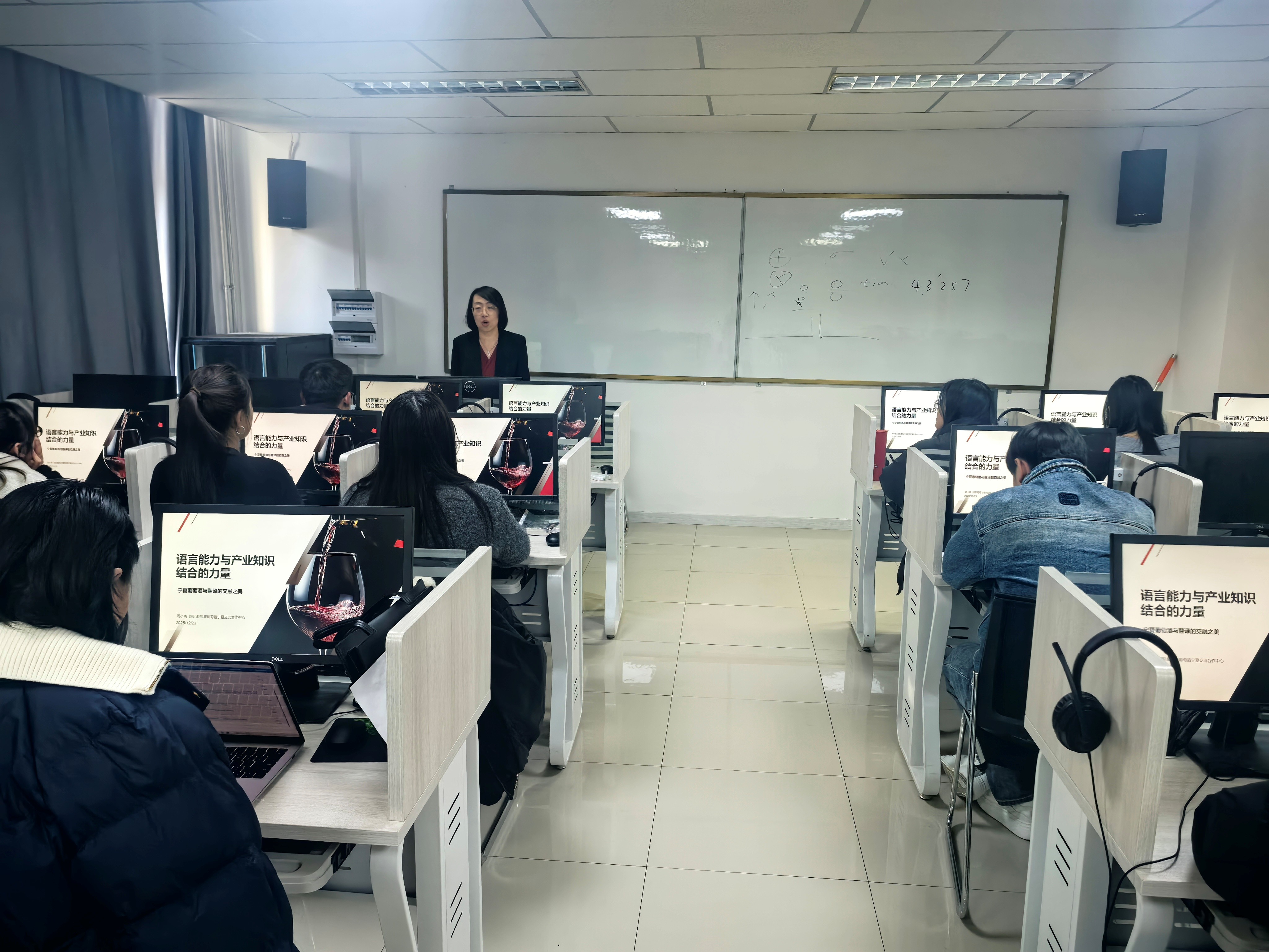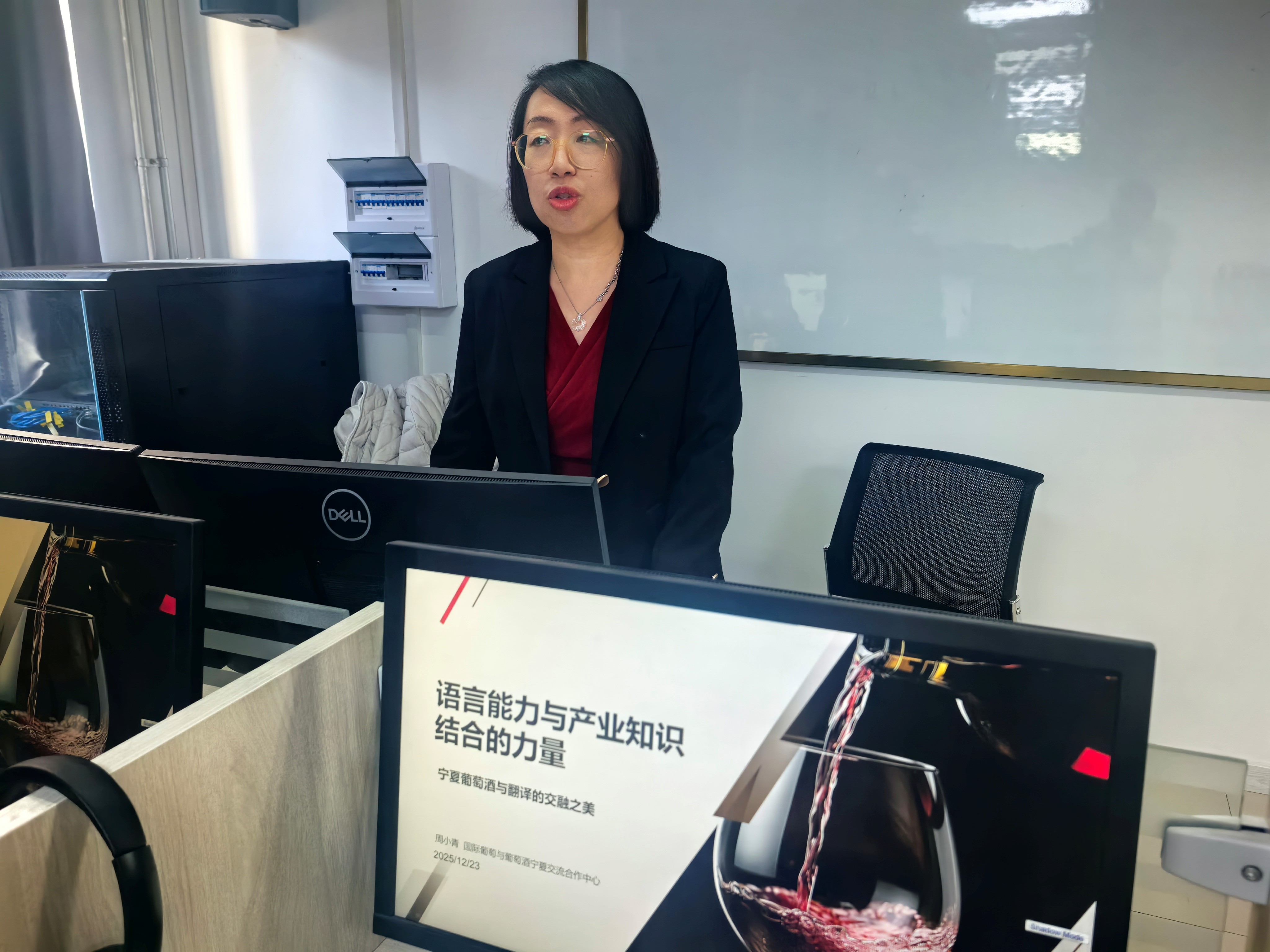 讲座中,周小青老师深入浅出地剖析了全球化背景下翻译行业面临的现实挑战和机遇,并指出:当下的语言服务工作者不仅需要扎实的双语功底,更需深厚的行业知识与文化理解力。周老师结合宁夏独具特色的葡萄酒产业,详细介绍了其发展历程、产区优势、品牌文化及国际交流现状,生动阐释了专业领域知识如何为翻译实践注入灵魂与精准度。