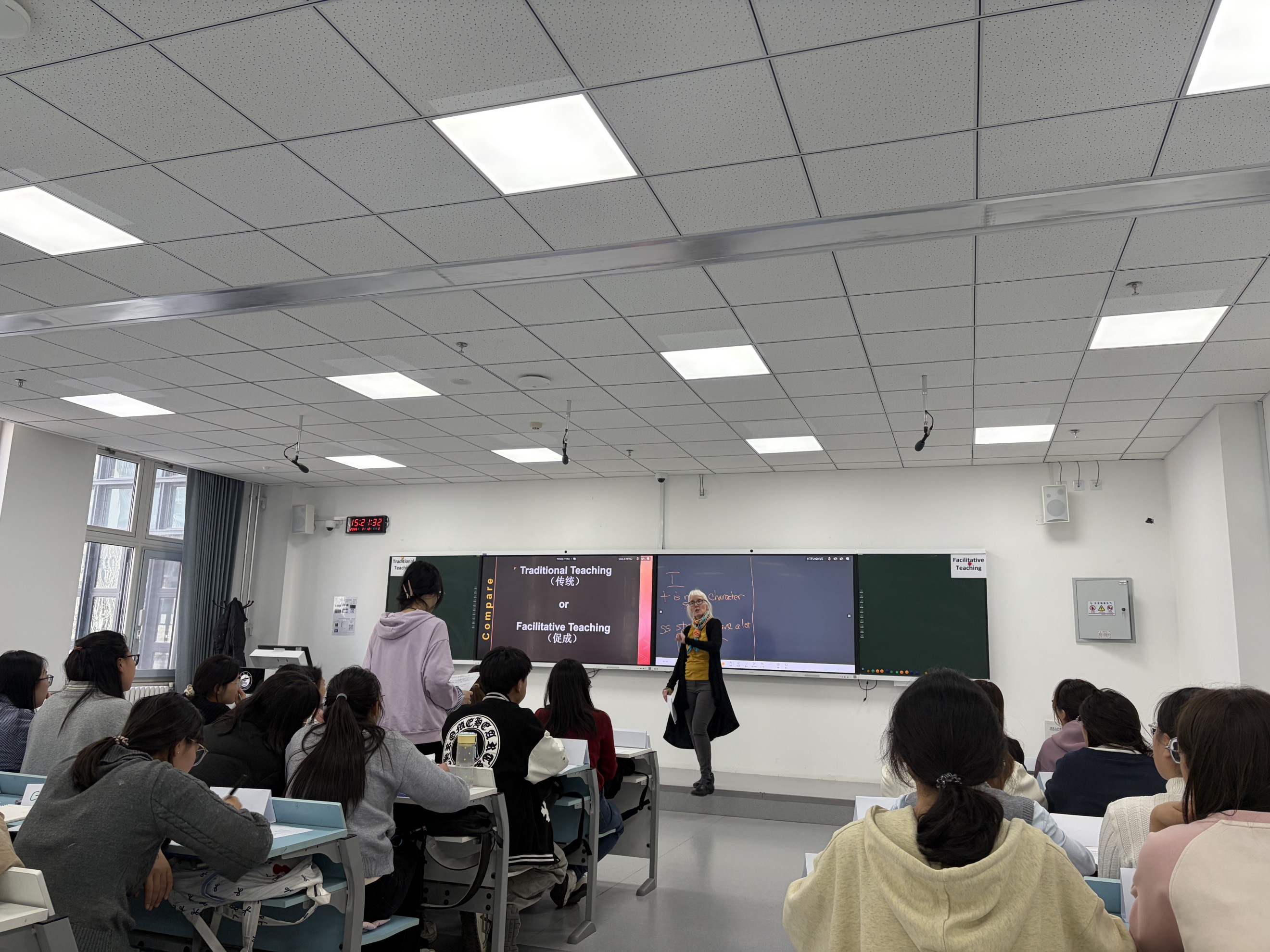 工作坊围绕“探究教学信念:传统教学与促进式教学(Traditional vs. Facilitative)”这一主线,采用讲授、小组讨论、问卷自评与反思写作相结合的形式,将“认识教学信念”这一抽象议题转化为具体可操作的学习任务。通过理论讲解与多元实践环节的有机融合,活动帮助师范生厘清不同教学理念的内涵,同时借助自评与反思训练,为其后续课堂观察、教学实践与教学研究做好了方法与理念上的准备。