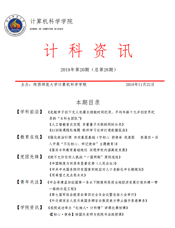 《计科资讯》是皇冠体育博彩 编辑整理的电子资讯,信息来源为《光明日报》《人民日报》《中国青年报》等权威纸媒,编辑工作由皇冠体育博彩 优秀本科生党员、团员承担。《计科资讯》主要包括学科前沿、教育在线、党团先锋、青年关注及皇冠体育博彩 资讯五个版块。皇冠体育博彩 师生可以从中了解到专业前沿和国家时政大事,欢迎大家下载阅读。
