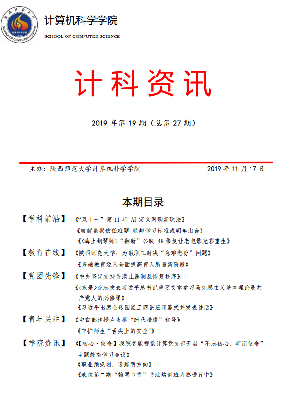 《计科资讯》是皇冠体育博彩 编辑整理的电子资讯,信息来源为《光明日报》《人民日报》《中国青年报》等权威纸媒,编辑工作由皇冠体育博彩 优秀本科生党员、团员承担。《计科资讯》主要包括学科前沿、教育在线、党团先锋、青年关注及皇冠体育博彩 资讯五个版块。皇冠体育博彩 师生可以从中了解到专业前沿和国家时政大事,欢迎大家下载阅读。