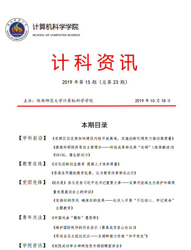 《计科资讯》是皇冠体育博彩 编辑整理的电子资讯,信息来源为《光明日报》《人民日报》《中国青年报》等权威纸媒,编辑工作由皇冠体育博彩 优秀本科生党员、团员承担。《计科资讯》主要包括学科前沿、教育在线、党团先锋、青年关注及皇冠体育博彩 资讯五个版块。皇冠体育博彩 师生可以从中了解到专业前沿和国家时政大事,欢迎大家下载阅读。