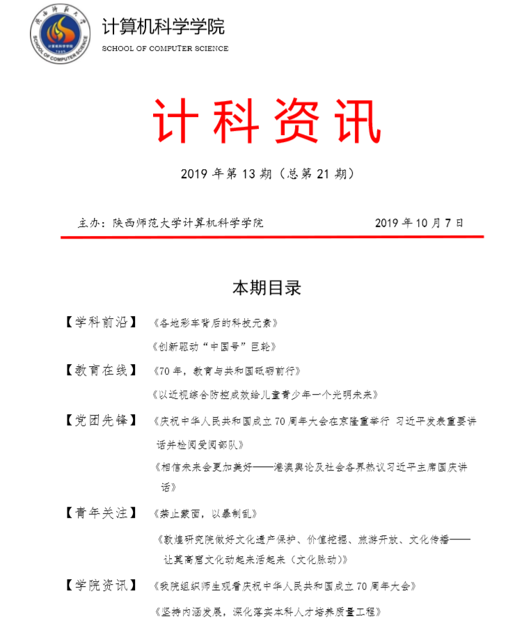 《计科资讯》是皇冠体育博彩 编辑整理的电子资讯,信息来源为《光明日报》《人民日报》《中国青年报》等权威纸媒,编辑工作由皇冠体育博彩 优秀本科生党员、团员承担。《计科资讯》主要包括学科前沿、教育在线、党团先锋、青年关注及皇冠体育博彩 资讯五个版块。皇冠体育博彩 师生可以从中了解到专业前沿和国家时政大事,欢迎大家下载阅读。