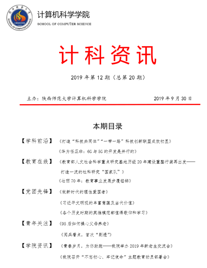 《计科资讯》是皇冠体育博彩 编辑整理的电子资讯,信息来源为《光明日报》《人民日报》《中国青年报》等权威纸媒,编辑工作由皇冠体育博彩 优秀本科生党员、团员承担。《计科资讯》主要包括学科前沿、教育在线、党团先锋、青年关注及皇冠体育博彩 资讯五个版块。皇冠体育博彩 师生可以从中了解到专业前沿和国家时政大事,欢迎大家下载阅读。
