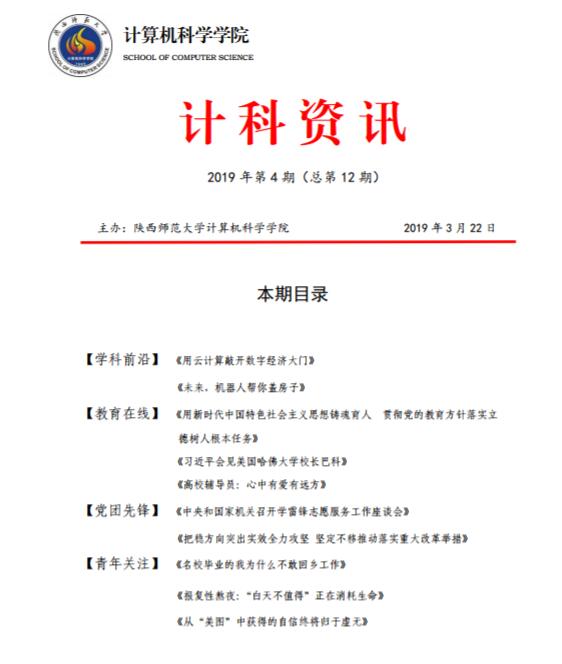 《计科资讯》是皇冠体育博彩 编辑整理的电子资讯,信息来源为《光明日报》《人民日报》《中国青年报》等权威纸媒,编辑工作由皇冠体育博彩 优秀本科生党员、团员承担。《计科资讯》主要包括学科前沿、教育在线、党团先锋、青年关注及皇冠体育博彩 资讯五个版块。皇冠体育博彩 师生可以从中了解到专业前沿和国家时政大事,欢迎大家下载阅读。