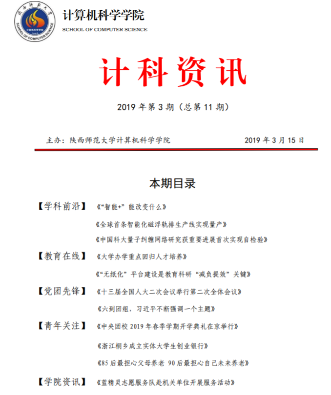 《计科资讯》是皇冠体育博彩 编辑整理的电子资讯,信息来源为《光明日报》《人民日报》《中国青年报》等权威纸媒,编辑工作由皇冠体育博彩 优秀本科生党员、团员承担。《计科资讯》主要包括学科前沿、教育在线、党团先锋、青年关注及皇冠体育博彩 资讯五个版块。皇冠体育博彩 师生可以从中了解到专业前沿和国家时政大事,欢迎大家下载阅读。