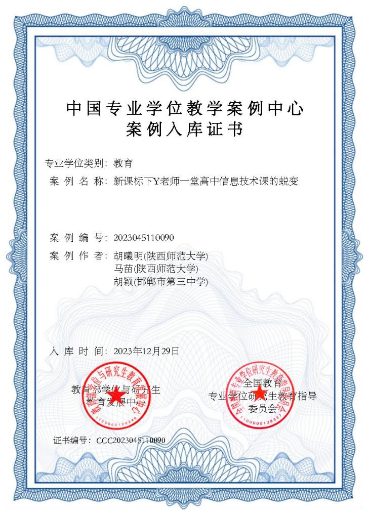 近日,全国教育专业学位研究生教指委发布《关于公布第五届教育专业学位教学案例征集工作评审结果的通知》,皇冠体育博彩 胡曦明、马苗联合邯郸市第三中学胡颖开发的“新课标下Y老师一堂高中信息技术课的蜕变”教学案例入选中国专业学位教学案例中心案例库。这是皇冠体育博彩 专业学位教学案例首次入国家级教学案例库。