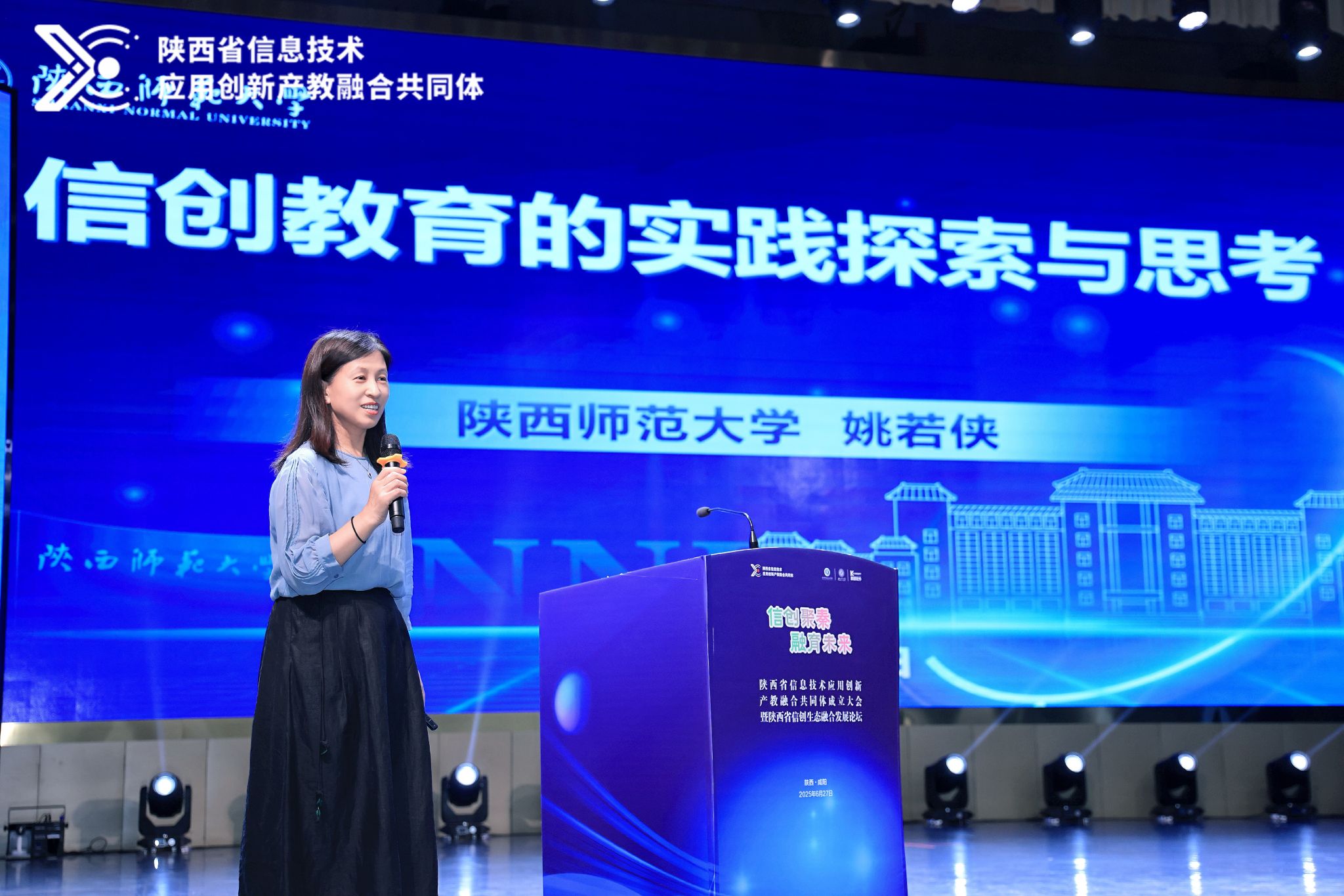 会议分两个阶段进行,第一阶段召开陕西省信息技术应用创新产教融合共同体成立大会;第二阶段举行陕西省信创生态融合发展论坛。姚若侠院长作为副理事长向大会作了《信创教育的实践探索与思考》报告,为推动信创产教融合、提升服务质量提供了方向和可行路径。