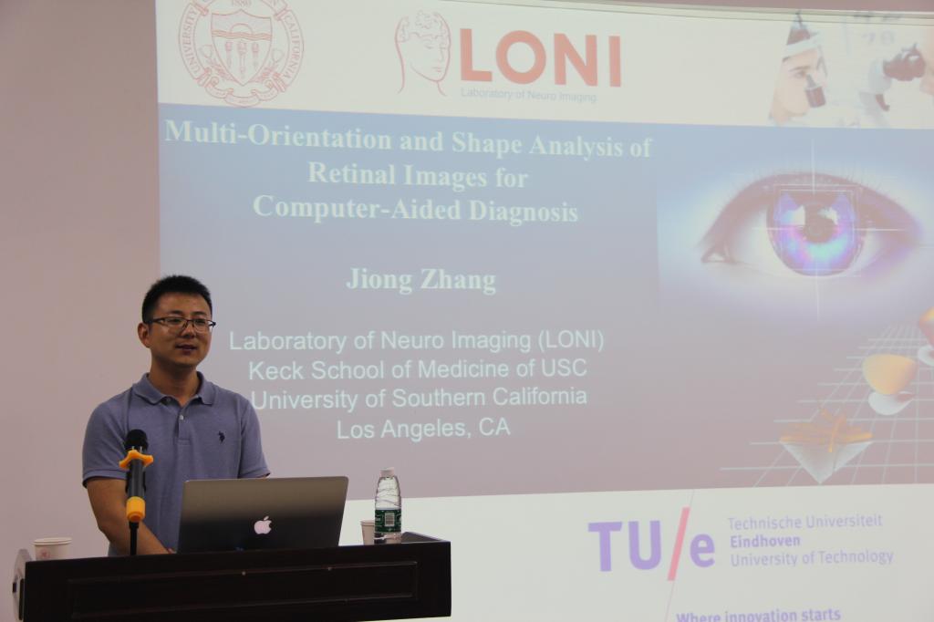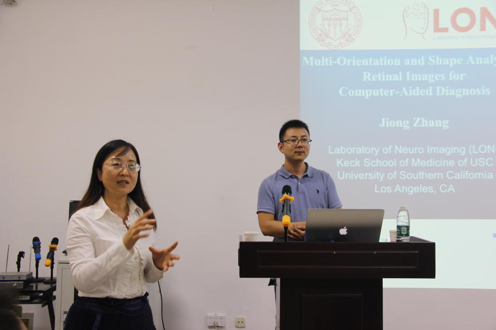 在报告中,张炯博士主要围绕从多方向和多尺度层面对视网膜图像进行处理展开。张炯博士结合二维视网膜血管弯曲程度与糖尿病发病机理的关系介绍了其研究背景,并对如何从多方向和多尺度来提取视网膜血管图像进行了详细的讲解。如获取生物标记信息、将图像从二维映射到三维、在三维空间中建模、血管分割和特征重要性分析等。最后,部分师生结合自身研究领域的相关问题与张炯博士进行了交流与探讨。张炯博士的报告内容丰富,结合实例生动地向研究生展示了如何做科学研究。为我们在生物医学和智慧医疗领域的研究提供了崭新的思路,开拓了学术视野。