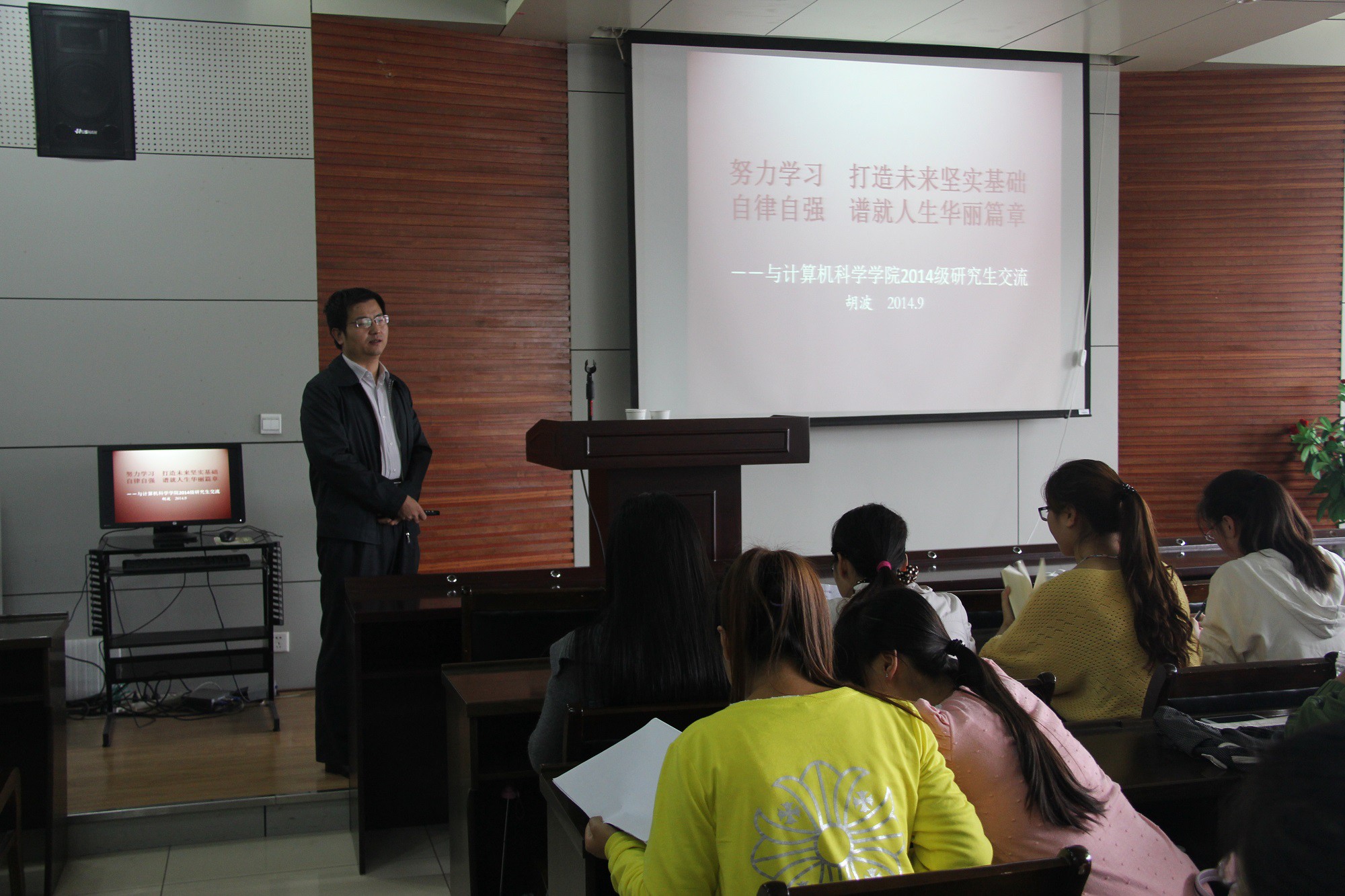 9月16日下午3点,皇冠体育博彩 2014年研究生新生入学教育报告继续举行。计科院党委书记胡波老师做了题为“努力学习,打造未来坚实基础;自律自强,谱就人生华丽篇章”的报告。报告中,胡波老师从何为研究生,研究生与本科生的区别,学习成本,学习榜样几个角度向新一级研究生介绍了读研的主要目标,研究生期间的学习之道,以及读研期间所需的付出,并鼓励同学们以施一公等知名人物为榜样,心怀远大目标,保持恒心。