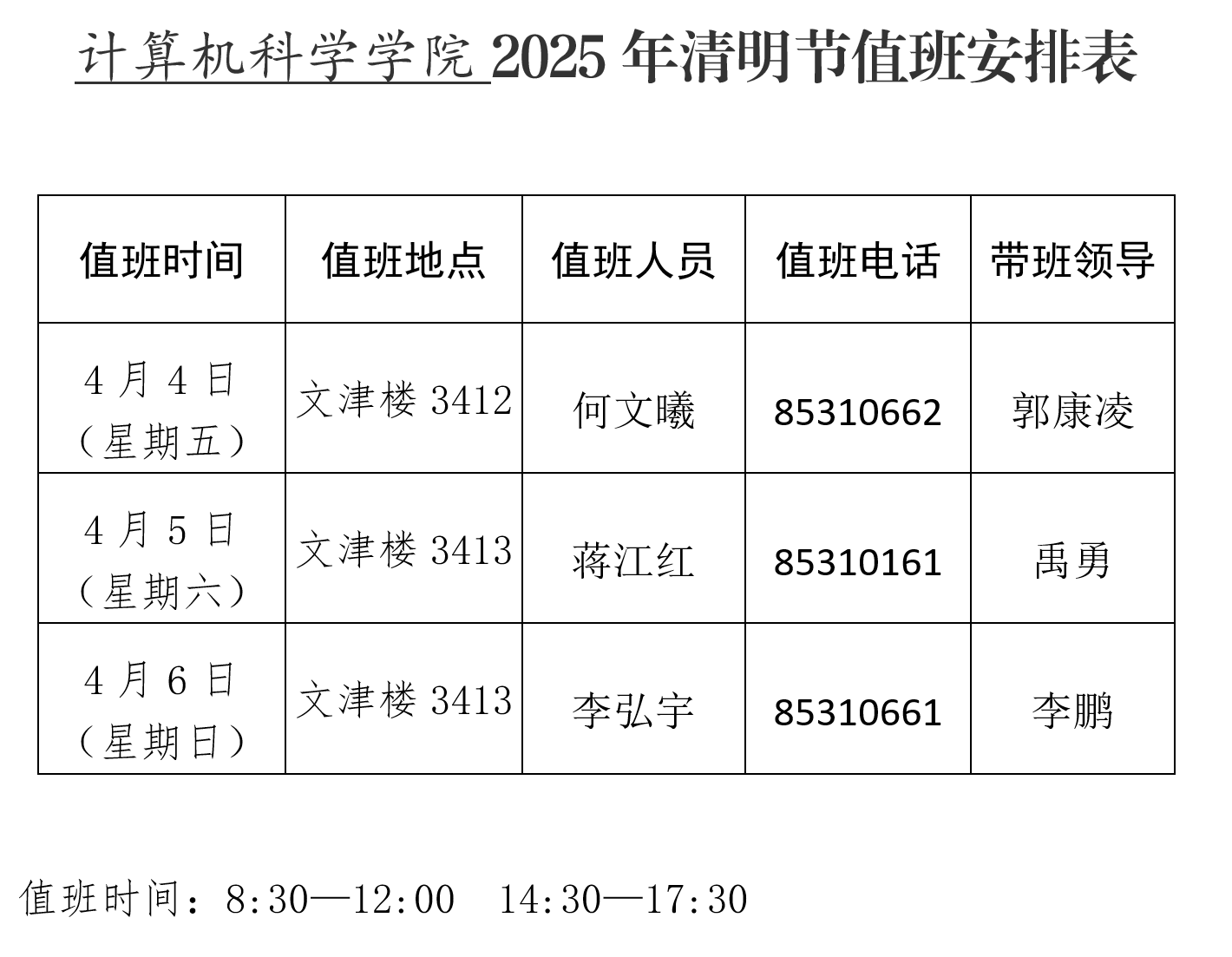 计算机科学皇冠体育博彩 2025年清明节假期值班安排