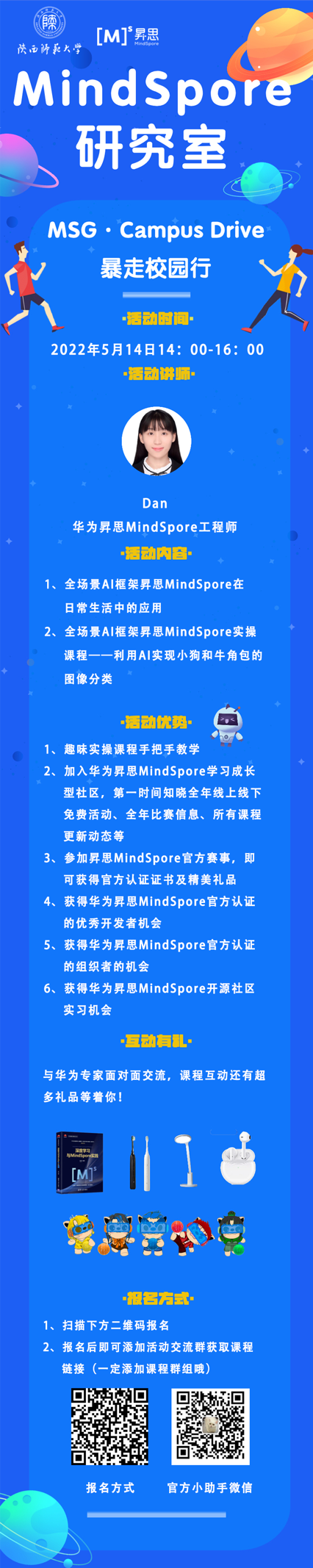 与华为昇思共同开展“MSG · Campus Drive”校园行活动,邀请华为昇思MindSpore工程师为全体学生做趣味AI实战讲座。