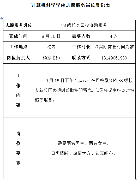 志愿服务岗位信息(9月16日)——皇冠体育博彩 88级校友回校协助后勤服务