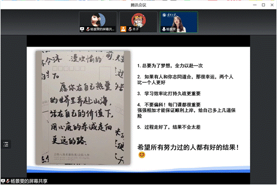 讲座的最后,杨景雯提出自己对同学们的寄语:希望大家都要为了梦想去全力以赴,在自己热爱的世界里奔赴山海,活在自己的价值下,用心底的赤诚走向更远的路,并祝愿所有2023届毕业生都能拥有更加美好的未来!