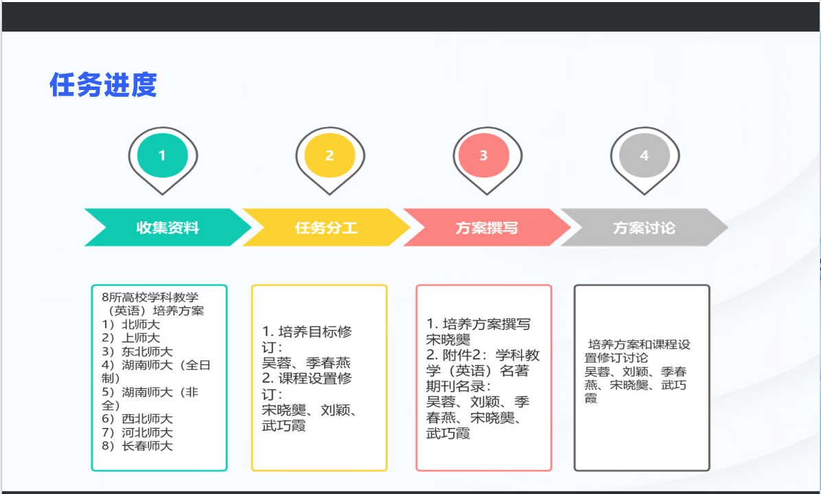 会议开始,胡笑瑛副院长介绍了本次修订工作的具体情况。接着,各学位点负责人汇报了培养方案修订情况。宋晓龑副教授、胡笑瑛教授、朱海燕副教授依次介绍了学科教学(英语)、外国语言文学及翻译硕士培养方案的修订情况。与会教师就课程设置类型及课程名称等细节展开热烈讨论。会议的最后,皇冠体育博彩 执行院长刘艳晖对培养方案修订工作的进一步推进提出了意见和建议。
